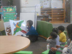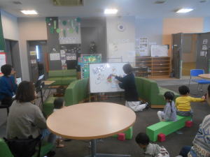 絵本や紙芝居、簡単な手遊び歌などを親子で一緒に楽しみます。途中で出入りしても