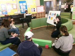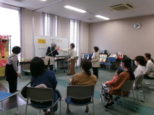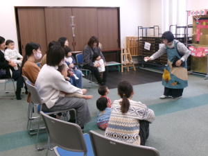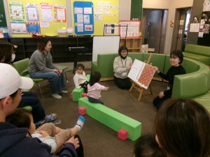 絵本や紙芝居、簡単な手遊び歌などを親子で一緒に楽しみます。途中で出入りしても